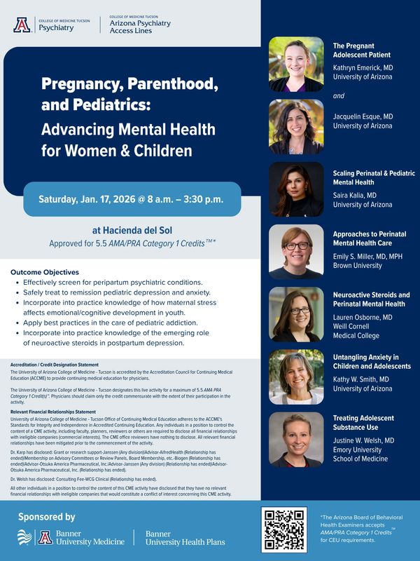 Complete details on presentations, the speakers, registration fees, and the registration link are available at Psychiatry.arizona.edu/PPP.